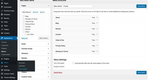 In WordPress haben Sie die Möglichkeit, Ihr Navigationssystem zu modifizieren, indem Sie in der linken Spalte auf die Registerkarte „Design“ und dann auf die Schaltfläche „Menüs“ klicken. Sie können mit der Erstellung des Menüs beginnen, Seiten hinzuzufügen und organisieren.